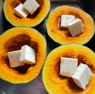 Divide the butter and maple syrup into the holes in the squash where the seeds were.